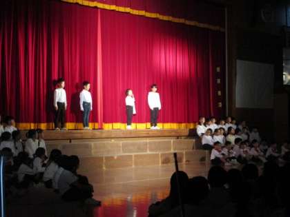 いよいよ学芸会当日を迎えました〜 今日は児童鑑賞日です。 1年生が「はじめのことば」を担当し、劇のスタートです〜