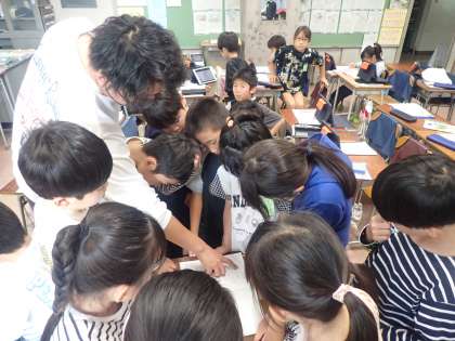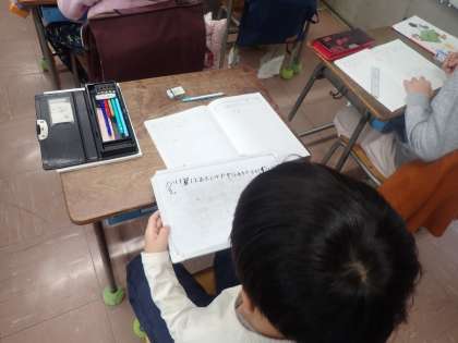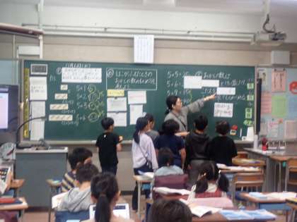 2年生の算数はかけ算の学習をしています。友達の考えを見たり聞いたりして、自分の考えを深めます。