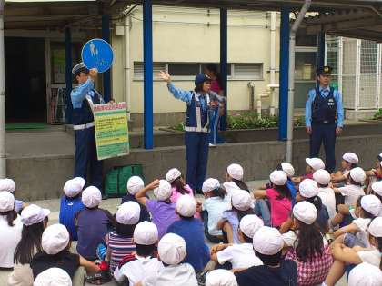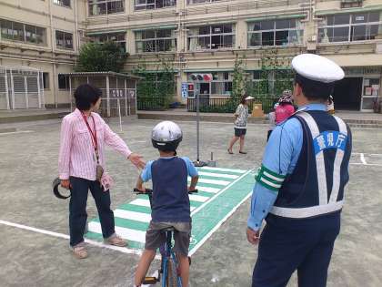 「自転車は、自動車の仲間であること」「車道の左側を走ること」「歩道を走る時には、車道側を走ること」「ヘルメットを着用すること」など、多くの規則を教えていただきました。その後、実際に校庭に設置された、道路標識や信号を守って自転車に正しく乗る方法を体験しました。皆、交通ルールに気をつけながら、慎重に運転できていました。うれしいことにほぼ全員の子供たちが、ヘルメットを着用していました。