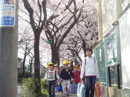 今日から集団登校です。6年生の班長さんを先頭にして、可愛い1年生と手をつないで仲良く登校します。