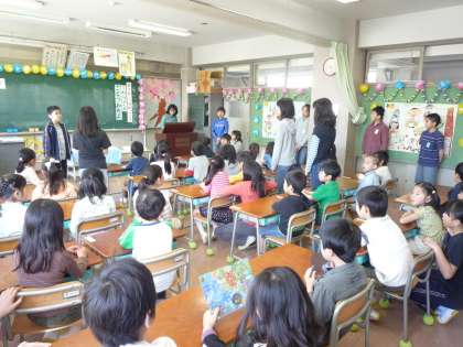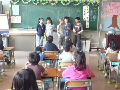 先生の伴奏で、校歌を歌って聞かせてくれたり、クイズや伝言ゲームをしてくれています。こんなつながりが、用賀小学校のなかよしタイムに生きてくるのです。