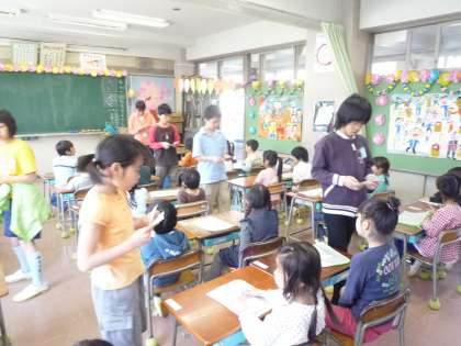 1年生のお教室には、毎朝6年生がいます。教室には、担任の先生がいるのですが、やはり用賀小学校の最高学年の6年生が、1年生のお世話をするのです。