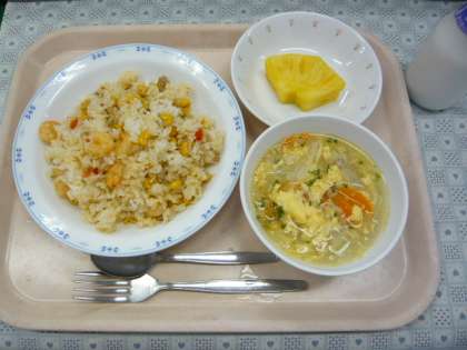 7/2 本日の給食 公開日 2012/07/02 更新日 2012/07/02 給食 〜今日の献立〜 ナシゴレン 牛乳 トマトと卵のスープ くだもの(沖縄パイン) 今日の果物は、今が旬のパインアップルでした。沖縄県石垣島でとれたものです。甘くて、とってもおいしかったです。 食材がとれたところ・・・ 閉じる 米…北海道 豚ひき肉…青森県 鶏肉…青森県 鶏がら…青森県 豚骨…青森県 鶏卵…青森県 しょうが…高知県 にんにく…青森県 ピーマン…茨城県 赤ピーマン…愛知県 たまねぎ…香川県 にんじん…千葉県 トマト…青森県 パセリ…長野県 パインアップル…沖縄県