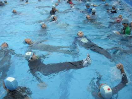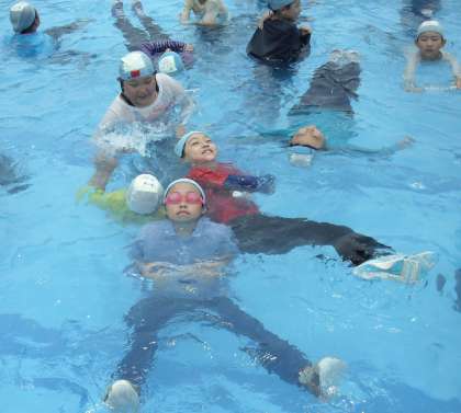 最後には、ペットボトルを浮きにして背浮きの姿勢をとってみると結構浮けることもわかりました。たった一本のペットボトルが命を救う場合もあるのです。