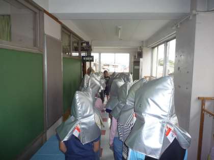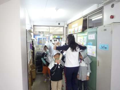 4月の避難訓練は、訓練の目的や、避難経路の確認をします。警報の後、放送の指示で廊下までの避難です。防災頭巾をかぶって、「お・か・し・も」の約束を守っての避難はとてもしっかりとできました。