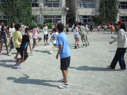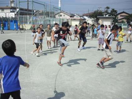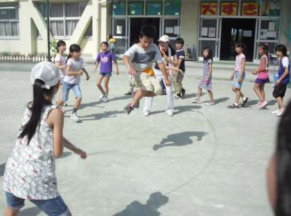 7/19 わくわくタイム 公開日 2012/07/19 更新日 2012/07/19 校長室より 今日の始業前は「わくわくタイム」です。朝早くから、先生と一緒にクラスみんなで楽しく遊びます。低学年は、担任の先生とゆったりと過ごしていますが、中・高学年は、長縄に取り組んでいるクラスが多くありました。高学年は、もうかなりの速い回転で長縄を跳んでいます。今日も朝から気温が高いので、こまめな水分補給をしっかり心がけさせます。