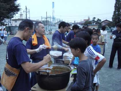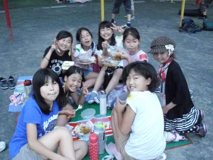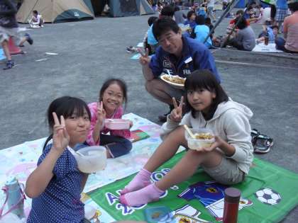 お泊まりといえば、夕食はもちろんカレーライスです。飯ごうで炊いたご飯と、役所からいただいたアルファー米です。おやじの会とPTAのお手伝いの方々の愛情たっぷりの、おいしいカレーライスをお腹いっぱいいただきました。スペシャルゲストとして、前校長の内藤先生も来てくださいました。