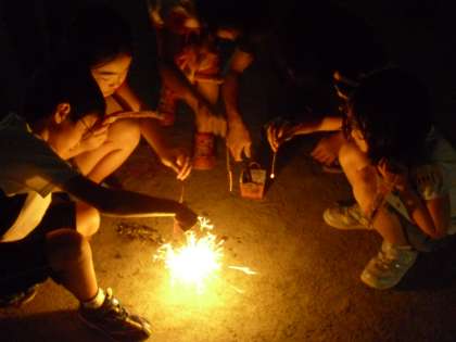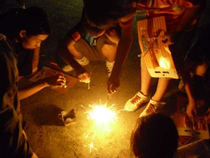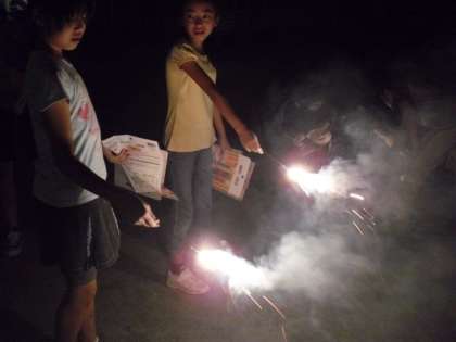 とっても怖い「肝試し」のあとには花火のプレゼントがまっていました。小さな花火ですが友達と一緒だと楽しさが倍増です。花火を見ながら、興奮した体の火照りを冷ましていきます。花火のあとにはアイスをいただきました。