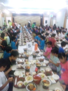日光林間学園、最初の夕食です。おかわりをたくさんしています。明日の登山に備えて、力をつけています。