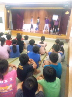 日光林間学園一日目 公開日 2012/07/25 更新日 2012/07/25 校長室より お楽しみの演芸大会。練習の成果を全力で発表しています。審査員は10人の先生方。会場が大きな笑いと笑顔でいっぱいになりました。