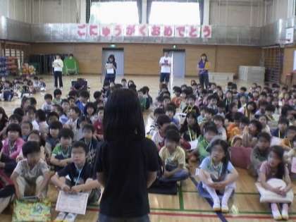案内した場所は、体育館、図書室、校長室、職員室、保健室、給食室、ランチルーム、2年生の教室といつもお世話をしてくれている6年生の教室です。はじめの会を体育館で行い、1年生の手をつないで、出発しました。「ここは、職員室で先生たちがたくさんいて、お仕事をしています」などと、説明をして案内します。昨日の練習のときは、不安の残る内容でしたが、今日は実に堂々と話ができて、さすが2年生です。