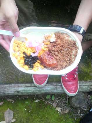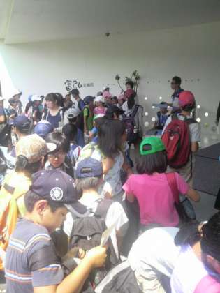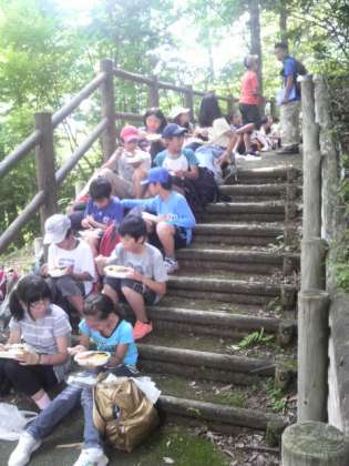 富弘美術館で、気に入った詩や絵を試写した後は、お弁当を食べました。大変暑いので、日陰のある階段で食べました。気温は、28度が表示されていました。
