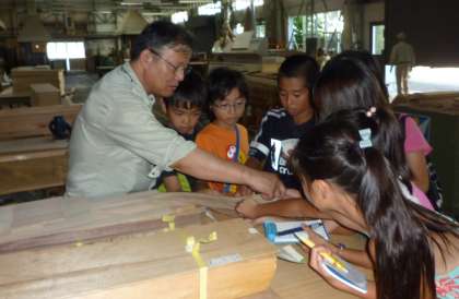 始めにどんな物を作っているか(机、椅子、黒板、お寺、コンサートホールなど)を紹介してもらい、私達の周りには木でできている物がたくさんあるこをを改めて知りました。