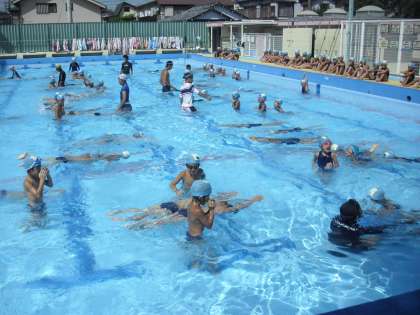 夏季水泳教室の後半が8月16日よりはじまっています。今日も低学年150名、中学年111名、高学年96名と大勢の子どもたちが参加しました。先生方も10名以上がプールに入り、手取り足取りの指導で少しでも子どもたちが良いフォームで、長い距離を泳げるように励ましています。子どもたちがより良く変容していく姿を見るのが私たちの幸せです。水泳教室は29日(水)まで行っています。28日(火)は夏休み最後の検定日です。多くの子どもたちの参加をお待ちしています。