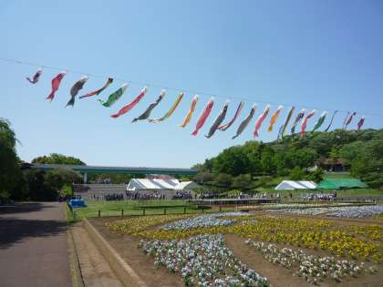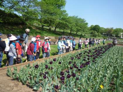雲ひとつない青空の中、3年生がこどもの国に遠足です。正門を入ってすぐ、花畑の上にたくさんの鯉のぼりがひらめいているのは壮観でした。子どもたちもびっくり!嬉しそうに見ていました。