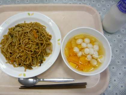 9/13 本日の給食 公開日 2012/09/13 更新日 2012/09/13 給食 〜今日の献立〜 ソース焼きそば 牛乳 フルーツ白玉 今日の給食は、人気メニューの「ソース焼きそば」でした。給食の焼きそばは、まず、麺を揚げてから、他の材料と炒めて作ります。麺を先に揚げておくことで、べたつかないおいしい焼きそばができます。 食材がとれたところ・・・ 閉じる 豚肉…静岡県 たまねぎ…北海道 にんじん…北海道 キャベツ…群馬県 もやし…栃木県 にら…栃木県