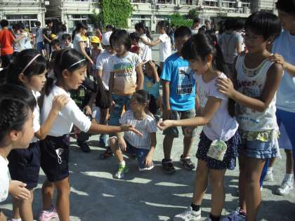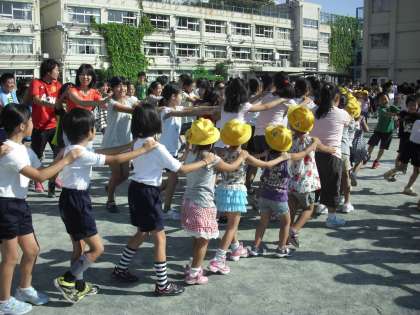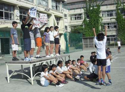 今日の児童集会はゲーム集会です。「ジャンケン子増やし」というゲームで、近くの人とジャンケンをして、勝ったら親となり、負けた人は親の肩につかまって後ろに付くというゲームです。まず、集会委員の子どもたちが見本を見せてゲーム開始です。簡単なゲームですが、いざやってみるとけっこう楽しいのです。子どもたちは勝つたびに声をあげて大喜びです。親を先頭にどんどん列が長くなりました。5回勝ちぬいた子は、ジャンケンチャンピオンとなりました。みんなを楽しませてくれた集会委員の皆さん、ありがとうございました。