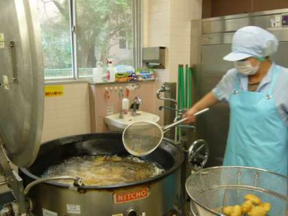 今日の写真は、コロッケを作っている様子です。1つ1つ丁寧に丸めて揚げました。ほとんど残菜がなかったので、とてもうれしかったです。