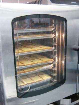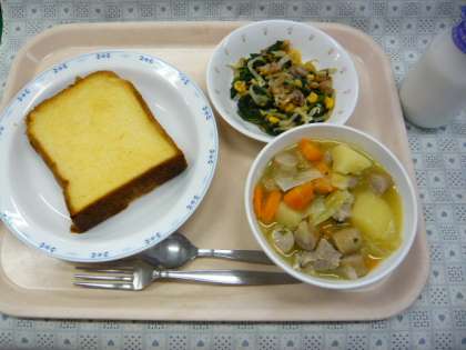 写真は、フレンチトーストを作っている様子です。給食室のオーブンは、1回で120枚の食パンを焼くことができます。