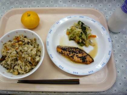 10/12 本日の給食 公開日 2012/10/12 更新日 2012/10/12 給食 〜今日の献立〜 豆入りひじきごはん 牛乳 鮭の南部焼き 和風サラダ くだもの(みかん) 写真は、「豆入りひじきごはん」を作っているところです。給食では、別に煮た具材を、炊きあがったごはんに混ぜ込んで作っています。 食材がとれたところ・・・ 閉じる 米…北海道 鶏肉…岩手県 鮭…チリ にんじん…北海道 ごぼう…青森県 キャベツ…茨城県 きゅうり…埼玉県 だいこん…北海道 みかん…愛媛県
