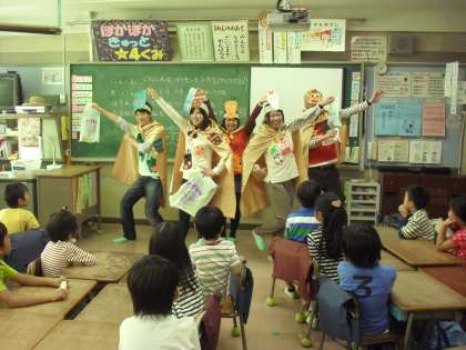 写真は1年生と2年生の授業の様子です。1年生の教室にはベジレンジャーが登場し、野菜の大切さについて、紙芝居を通して話をしてくれました。この授業の後には、嫌いな野菜が食べられるようになったという嬉しい報告が毎年あります。東京農業大学の古庄先生をはじめとする学生の皆さん、毎年ありがとうございます。
