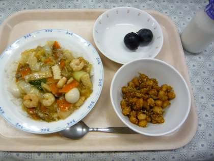 10/17 本日の給食 公開日 2012/10/17 更新日 2012/10/17 給食 〜今日の献立〜 中華丼 牛乳 大豆とじゃこの甘辛揚げ くだもの(巨峰) 給食では、化学調味料は使わず、和風だしはかつおぶしや昆布から、洋風・中華だしは鶏がらと豚骨からとっています。今日の中華丼にも、朝からコトコト鶏がらと豚骨を煮てとっただしを使いました。 食材がとれたところ・・・ 閉じる 米…北海道 豚肉…静岡県 いか…ペルー えび…ミャンマー じゃこ…広島県 にんにく…青森県 しょうが…高知県 にんじん…北海道 長ねぎ…青森県 はくさい…長野県 チンゲン菜…群馬県 巨峰…長野県