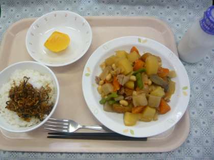 今日は、11月8日「いい歯の日」です。そこで、今日は「かむこと」について考えてもらいたいと思い、かみごたえのある「かみかみ佃煮」を出しました。よくかむと、脳のはたらきをよくしてくれたり、むし歯を予防してくれるなど、体によいことがたくさんあります。「かみかみ佃煮」は、簡単に作ることができるので、ぜひ、ご家庭でも作ってみて下さい。