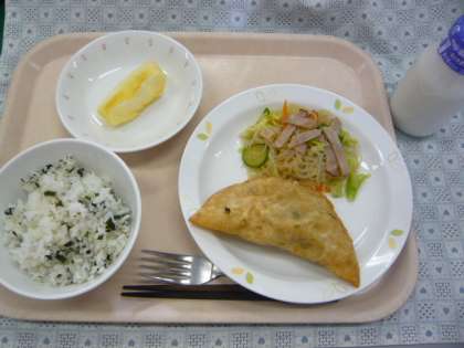 今日は、人気メニューの「ジャンボぎょうざ」でした。1つ1つ包んで、揚げています。朝から調理員さんが頑張って作ってくださいました。