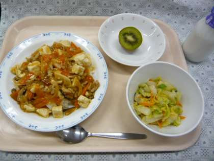 11/22 本日の給食 公開日 2012/11/22 更新日 2012/11/22 給食 〜今日の献立〜 家常豆腐丼 牛乳 辣白菜 くだもの(キウイフルーツ) 今日の「家常豆腐」は、麻婆豆腐に似た、辛い豆腐料理です。給食では、子どもが食べやすいように、辛さ控え目にしています。また、低学年と高学年でも辛さを変えて作っています。返ってきた食缶を見ると、ほとんどのクラスが空っぽで、とてもうれしかったです。 食材がとれたところ・・・ 閉じる 米…北海道 豚肉…静岡県 にんにく…青森県 しょうが…高知県 にんじん…北海道 長ねぎ…青森県 はくさい…茨城県 キウイフルーツ…熊本県