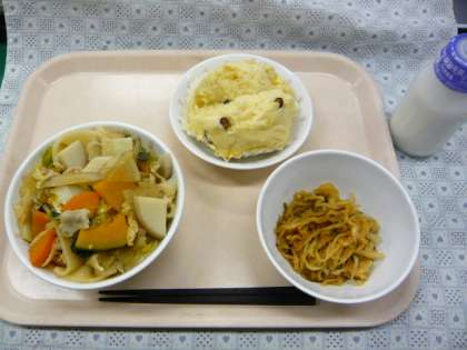 ほうとうは、麺や野菜を煮込んだ味噌味の料理です。今日のほうとうには、里芋やごぼう、大根、白菜など旬の食材がたくさん入っていています。今日も残さずに食べてくれるとうれしいです。