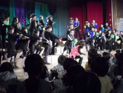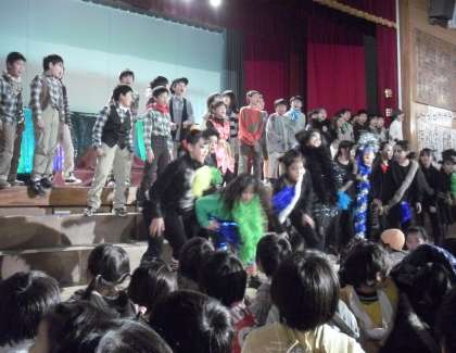 5年生は「魔法をすてたマジョリン」です。5年生が演じることはもちろんですが、スポットライトなどの裏方もすべて自分たちで構成しました。5年生にとっては最後の学芸会となってしまいますが、「劇団用賀5年生」としての責任・信頼・誇りを見事に達成しました。「マジョリン」は、個性的な役づくりが多いのですが、とても迫力があり、5年生の真剣さと勢いを感じました。本当はあのように意地悪ではないんですよ!時間を忘れて見入ってしまいました。