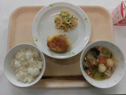 麦ごはん ゼリーフライ もやしのごま酢あえ まゆ玉汁 牛乳