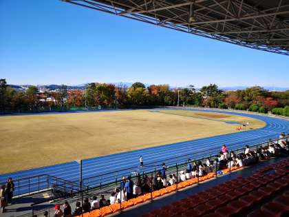 大蔵総合運動場 陸上競技場到着しました。富士山に見守られながら成果を発揮します。