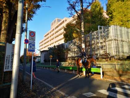 本日の朝、道路を歩く練習をしていた警視庁騎馬隊「優輝」さんに会えました。きりりとかっこいい姿と優しいまなざしでした。騎馬隊に入隊するタイミングで東深沢小の児童が命名したそうです。お父さんはルーラーシップです。