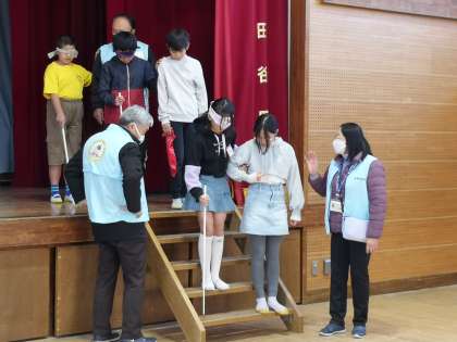 白杖体験 総合的な学習の時間 4年 公開日 2024/12/09 更新日 2024/12/09 今日のできごと 用賀地区社会福祉協議会の皆様による白杖体験を実施しています。「階段の高さが分からなくて不安だった。」と話していました。