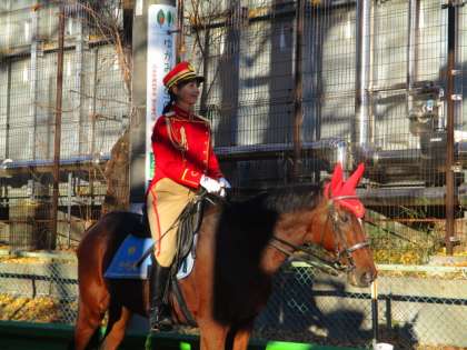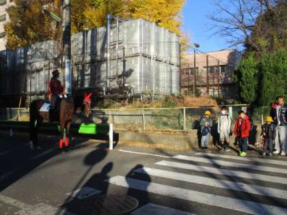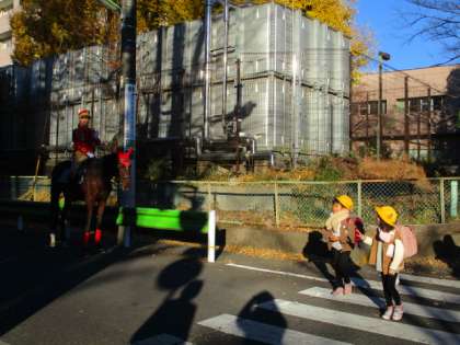 馬事公苑のお馬さんが帰ってきて、用賀小の子どもたちの登校の様子の見守りをしてくれています。