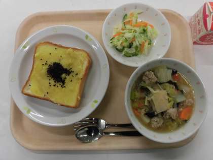 スイートポテトースト 白菜と肉団子のスープ煮 フレンチサラダ 牛乳