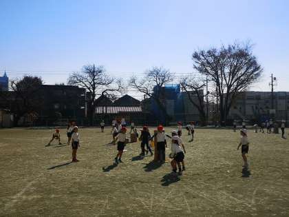 簡単なボール操作と攻めや守りの動きによって、易しいゲームを行っています。友達を呼んだり励ましたりする声や、得点を決める歓声で盛り上がっています。