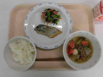 ごはん 魚の西京焼き 野菜の梅のりあえ 七草雑煮 牛乳