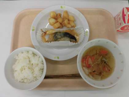 ごはん 魚のみそマヨネーズ焼き じゃがいもの甘辛煮 白菜のすまし汁 牛乳