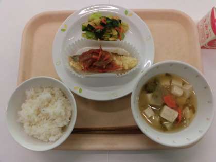 有機米ごはん 魚の変わりソース 野菜のポン酢あえ とうふのみそ汁 牛乳