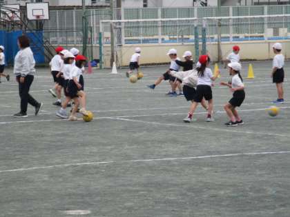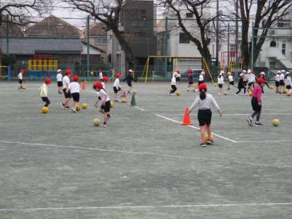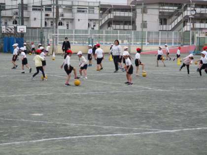 ボールけり遊び〜1年 公開日 2025/02/03 更新日 2025/02/03 今日のできごと 1年生の「ゲーム」の学習です。 簡単なボール操作と、攻めや守りの動きによって、易しいゲームに挑戦です・・・・