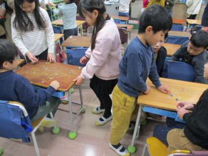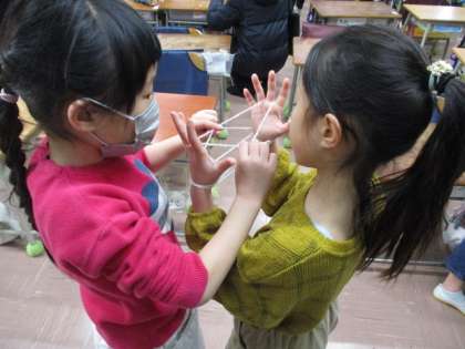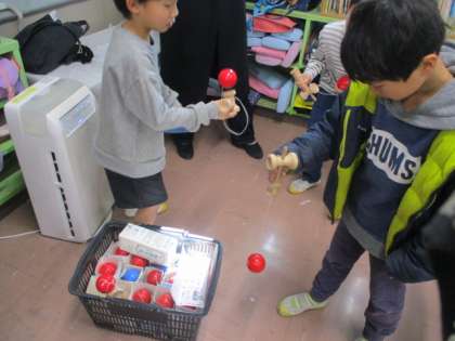 お手玉、けん玉、おはじき、あやとりなどの遊びにみんなで挑戦しました〜