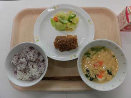 ゆかりごはん 生揚げの肉みそあんかけ 塩だれキャベツのサラダ かきたま汁 牛乳