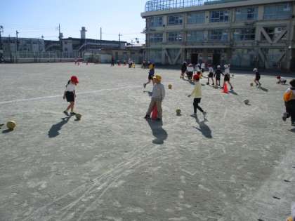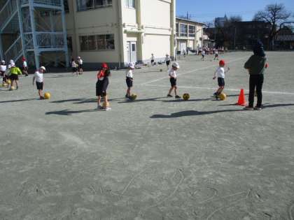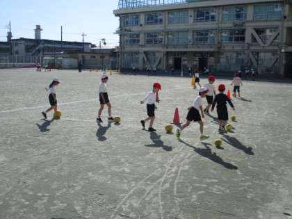 校庭に設置したコーンを上手に避けたり通ったりしながら、ボールを運ぶボールけり遊びに挑戦しました〜