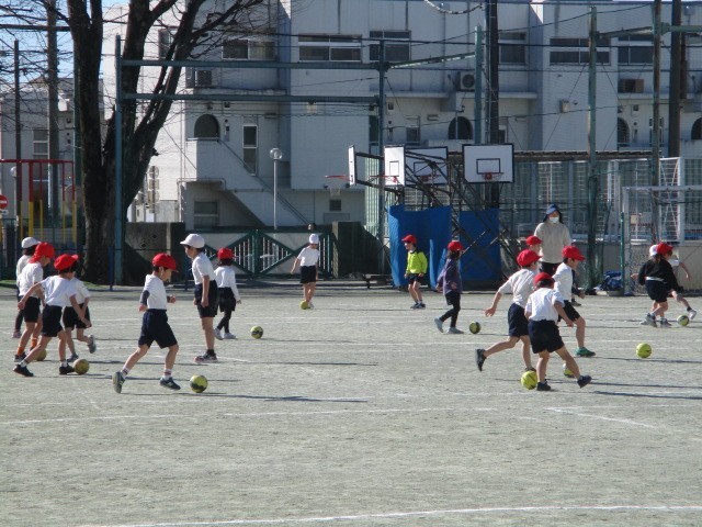 ボールけり遊び~1年 公開日 2025/02/19 更新日 2025/02/19 今日のできごと 体育のボールゲームの学習です。ボールをけってうまく運ぶ活動に取り組んでいました~低学の簡単なボール操作と、攻めや守りの動きによる易しいゲームの学習は、中学年でのゲームの学習につながっていきます・・・