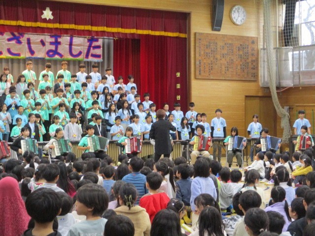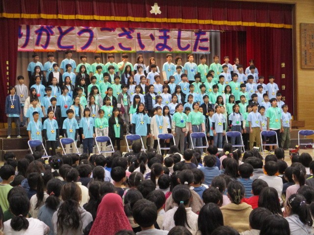 6年生の演奏、歌を聴き、全員で合唱しました~