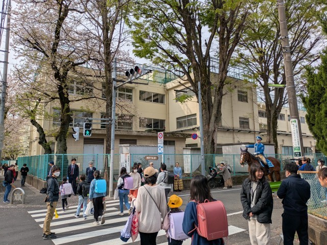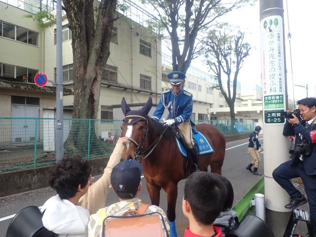 本格的な学童交通整理の再開のため、警視庁騎馬隊への取材がありました。翼号は、たくさんの子どもたちや保護者、通行する方に声を掛けられていました。私たち自身も交通安全に十分に気を付けてまいります。