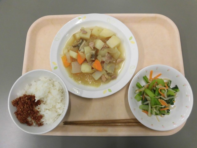 ごはん かつおでんぶ 鶏じゃが 野菜のからしじょうゆあえ 牛乳
