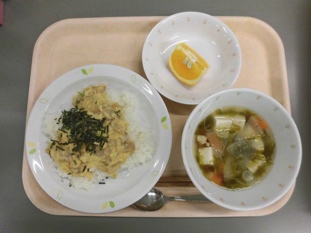 親子丼 あおさ汁 サンフルーツ 牛乳